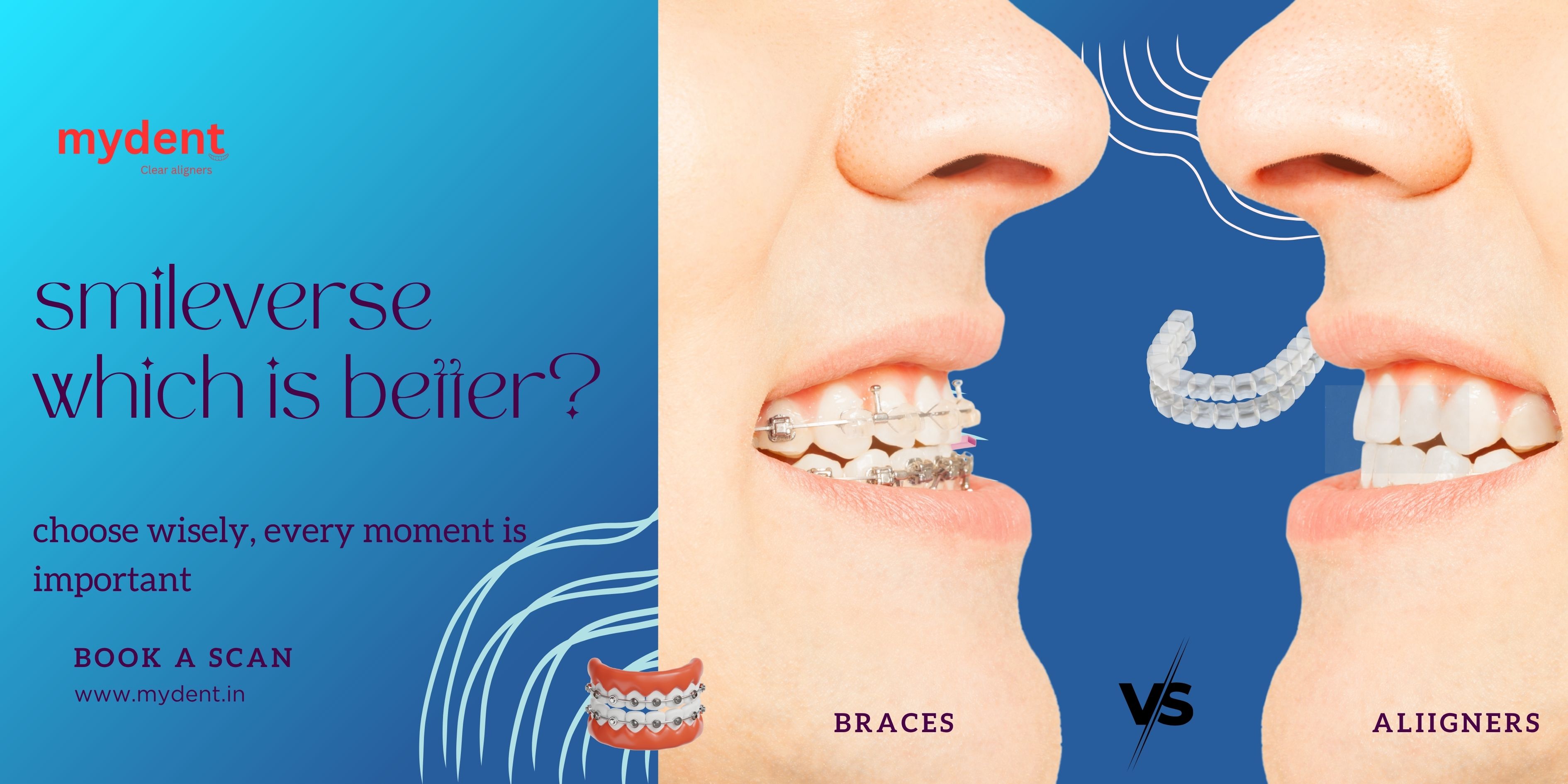 Braces Cost in India Wondering how much braces really cost in India? The price can vary based on the complexity of your case, treatment time, and the type of braces you choose. Traditional metal braces usually start around ₹25,000, while more advanced options like lingual braces can go up to ₹2,00,000. But there's a better way. mydent Aligners offer an affordable with EMI options .Our clear, comfortable, and modern alternative, aligners are nearly invisible, removable, and custom starting at just ₹3,019/month - made for your smile.